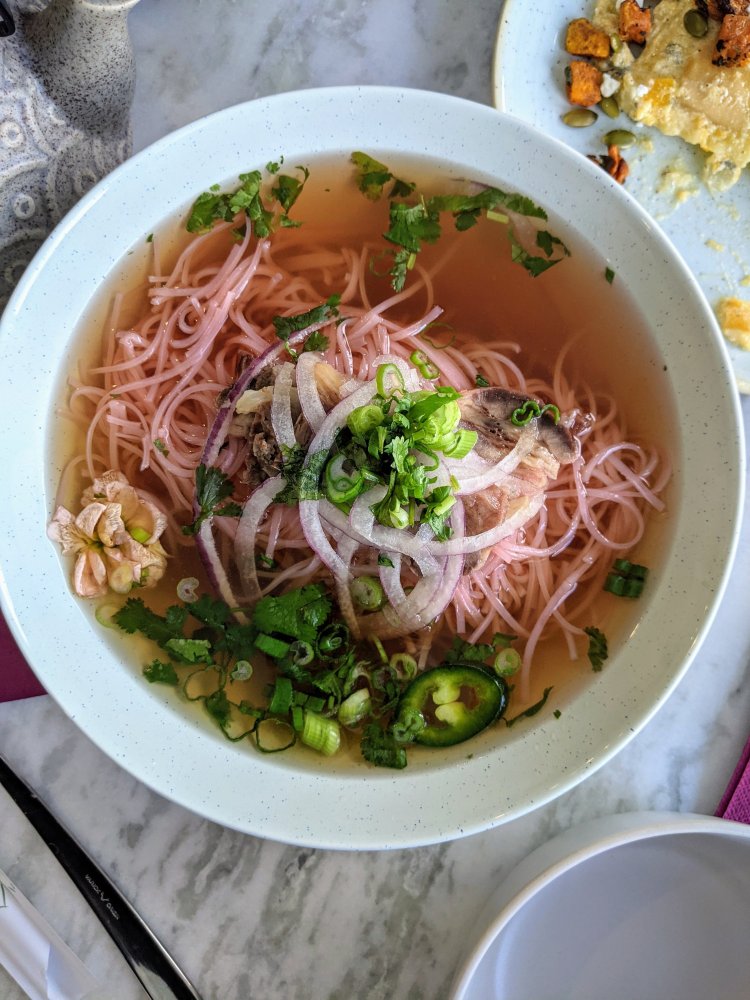 The Empress Bowl is Brew + Bloom’s take on pho. It features beet infused rice noodles, sliced beef, and your usual toppings of onion and cilantro. While there isn’t a beet taste, the pink noodles sure made the bowl look prettier than your average bowl of pho. The broth itself is a bit lighter but still quite tasty. Any fat is skimmed off so the broth is clean and non-greasy, fitting with the “healthy” theme as Their pho is based off a family recipe which makes it extra special but the coolest part of this dish is that it was also interactive! The broth is served on the side in a teapot and you can pour it in yourself.