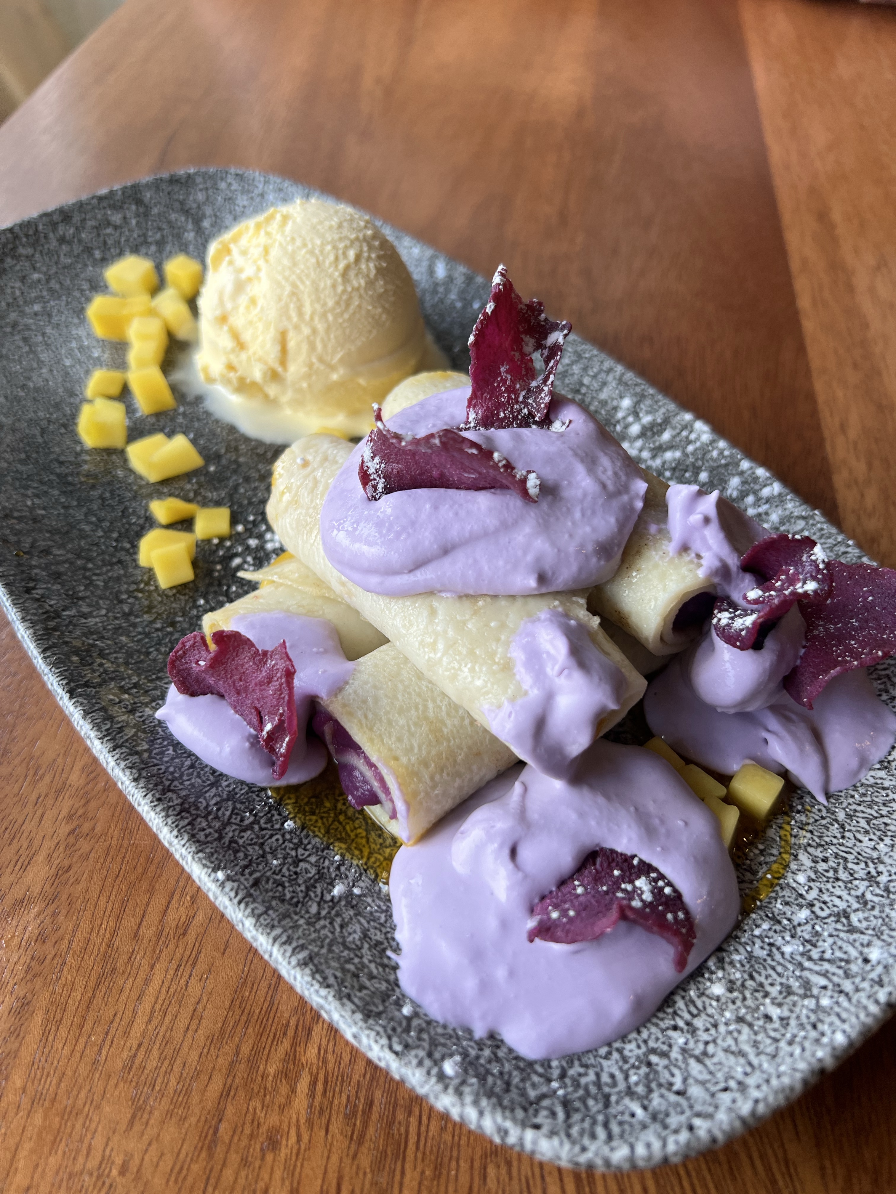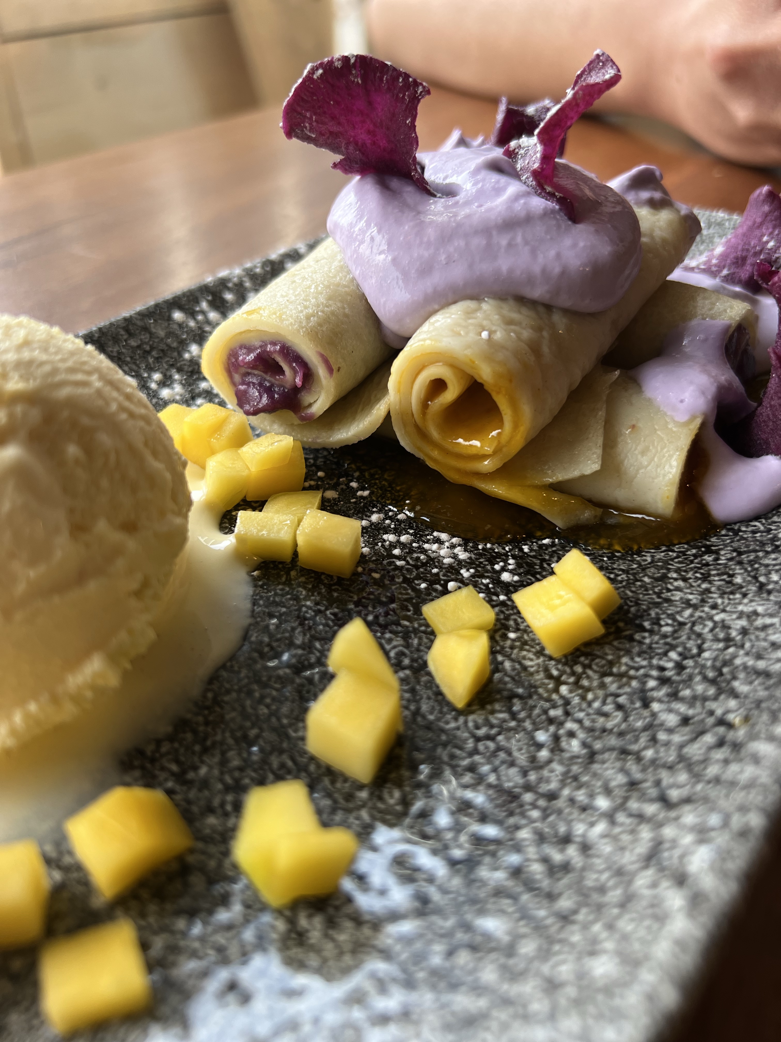 For dessert, we finished off with the Ube & Mango Crepes which were absolutely delicious. It was definitely my highlight of the meal and encapsulated well-known Filipino flavours beautifully. The dish tasted great but I also loved the presentation and how all the details were so well thought out – ube cream, ube chips, and mango compote! This is a must try if you’re visiting.